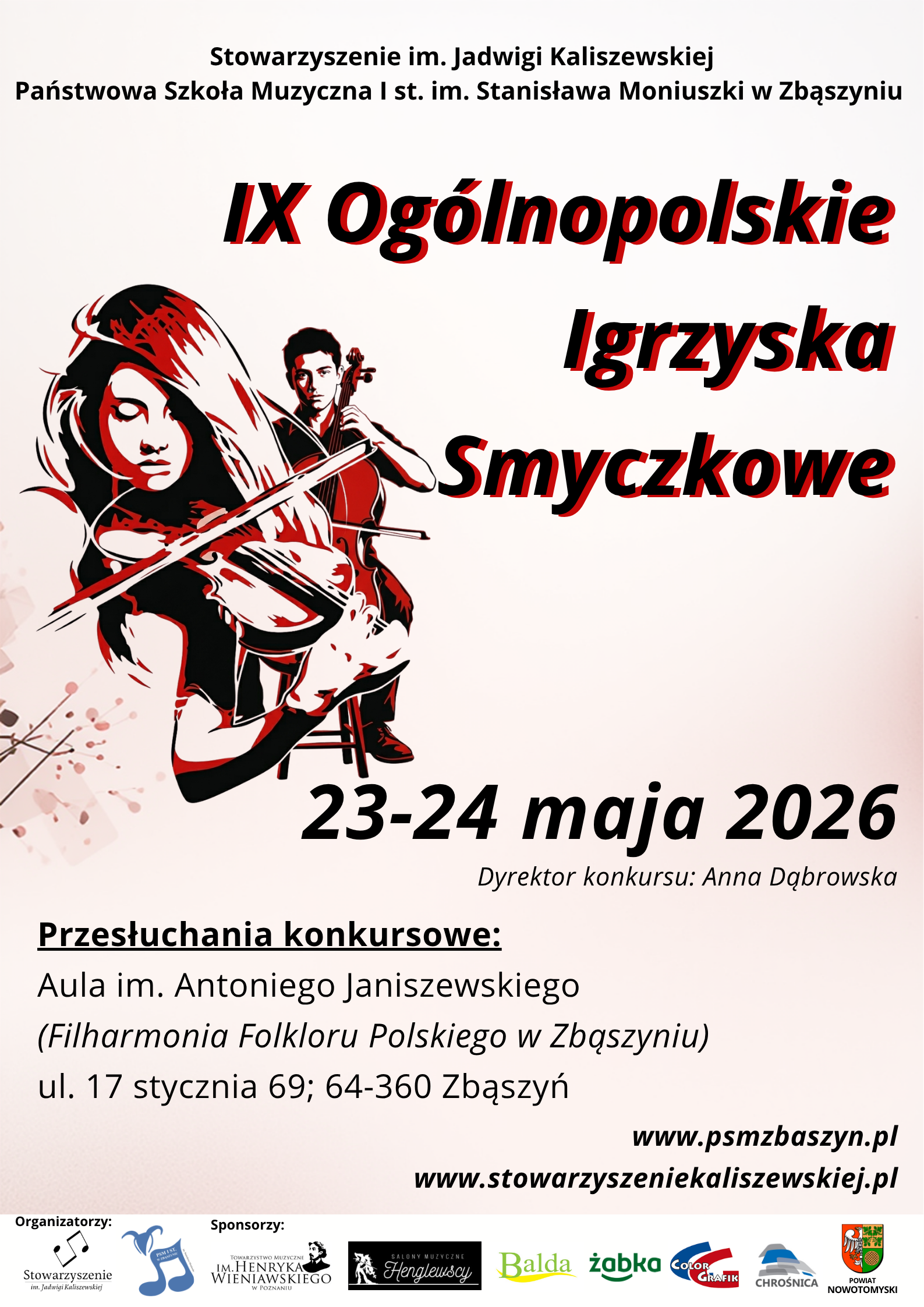 Z radością informujemy o kolejnej edycji Igrzysk Smyczkowych. Tym razem konkurs organizoway jest dla skrzypków i wiolonczelistów. Organizatorami jest Stowarzyszenie im.Jadwigi Kaliszewksiej i Państwowa Szkoła Muzyczna I stopnia im. Stanisława Moniuszki w Zbąszyniu.